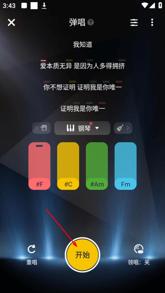 2、進入彈唱頁面后,點擊頁面下方的開始按鈕,開始彈唱操作。