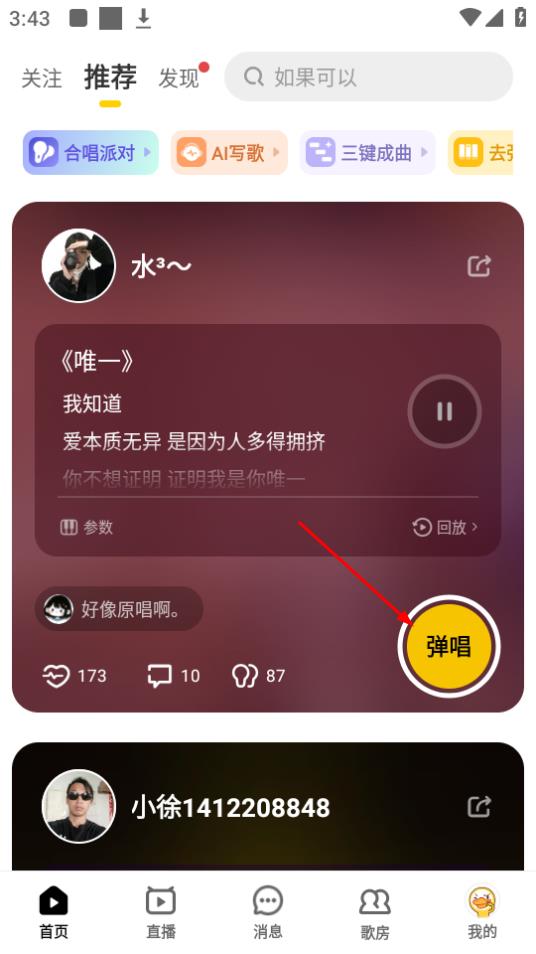 1、在唱鴨推薦頁面,找到帶有歌曲唯一的內(nèi)容卡片,點擊卡片上的彈唱按鈕。