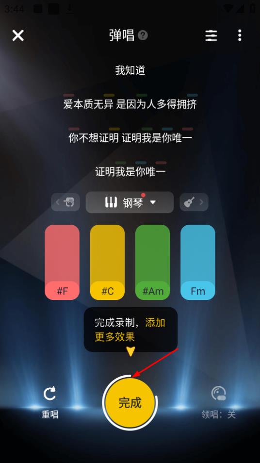 4、彈唱完成后,點擊頁面下方的完成按鈕,結(jié)束彈唱錄制。