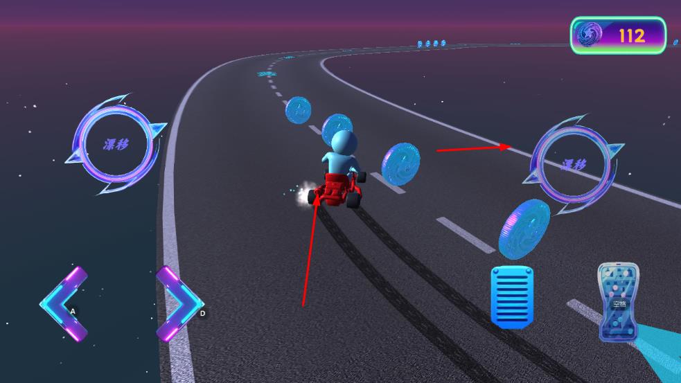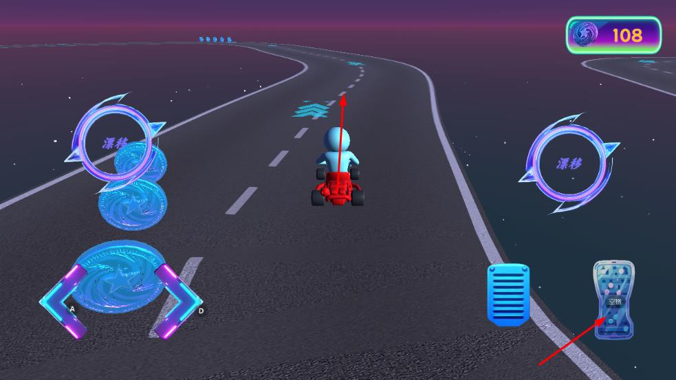 1、操控賽車在道路行駛,利用AD鍵或?qū)?yīng)方向按鈕調(diào)整方向,還能點(diǎn)擊漂移按鈕,靈活過(guò)彎。