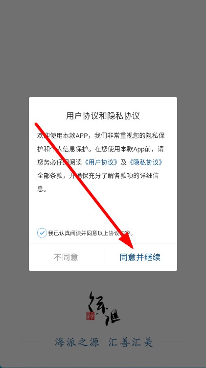 1、打開APP,在用戶協(xié)議和隱私協(xié)議頁面,點(diǎn)擊同意并繼續(xù)。