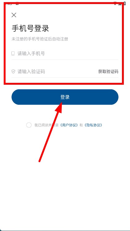 4、輸入手機(jī)號、驗(yàn)證碼,勾選后,點(diǎn)擊登錄按鈕,完成注冊。
