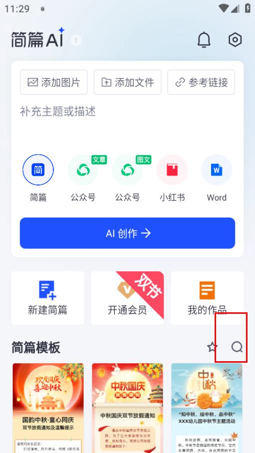 1、進(jìn)入簡篇頁面,若要搜索模板,可點(diǎn)擊簡篇模板右側(cè)的搜索圖標(biāo)。