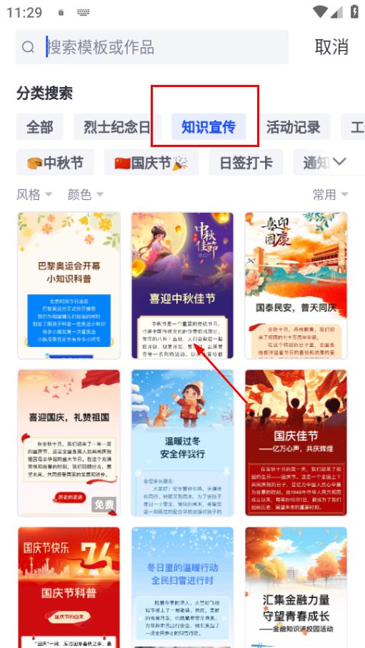 2、在搜索頁面,選擇知識宣傳分類,找到心儀的模板,比如喜迎中秋佳節(jié)模板點(diǎn)擊。