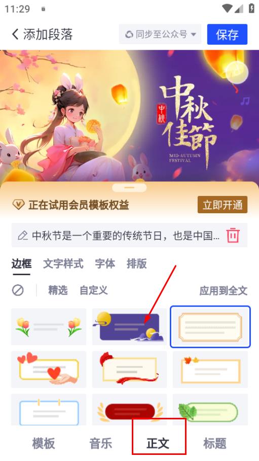 4、進(jìn)入編輯頁面后,點(diǎn)擊正文對正文邊框進(jìn)行設(shè)置,設(shè)置好后點(diǎn)擊保存即可。