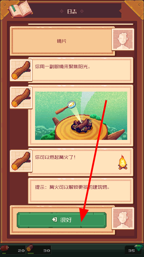 2、完成采集等操作后,會(huì)彈出日志界面,展示任務(wù)相關(guān)信息,像用眼鏡聚焦陽光燃起篝火等,閱讀后點(diǎn)擊很好等按鈕,確認(rèn)并繼續(xù)后續(xù)冒險(xiǎn)。