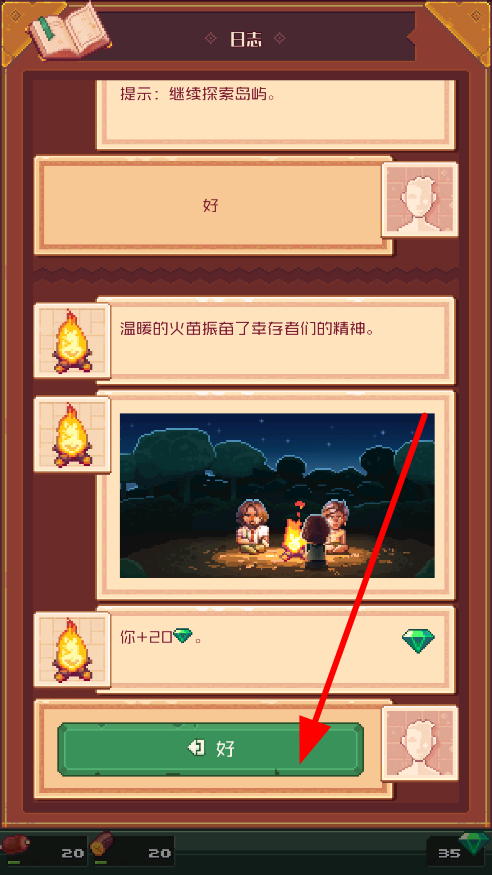 4、完成生火等任務(wù)后,日志會(huì)提示繼續(xù)探索島嶼,島嶼上進(jìn)一步探索,發(fā)現(xiàn)新的區(qū)域與綠色鉆石資源,持續(xù)推進(jìn)在流浪者小島上的生存與冒險(xiǎn)。