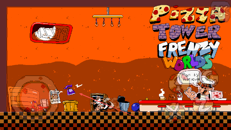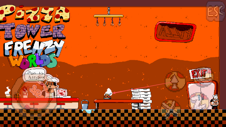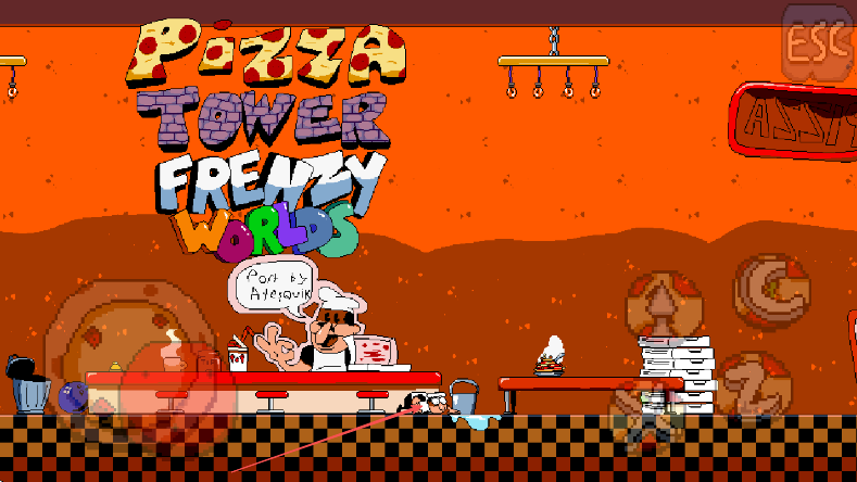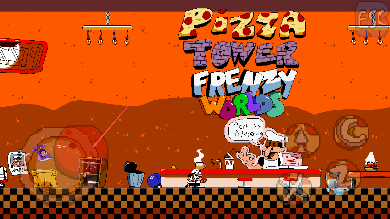 1、進入PizzaTowerFrenzyWorlds游戲,觀察披薩店場景和角色位置。