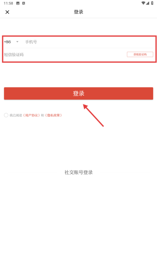 4、在登錄界面,輸入手機號碼和驗證碼,點擊登錄按鈕,完成賬號登錄操作。