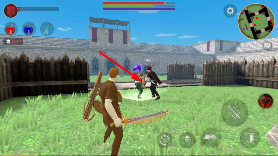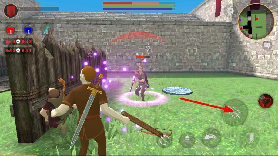 3、點(diǎn)擊弓箭按鍵,可切換武器為弓箭,進(jìn)行遠(yuǎn)程攻擊,在安全的距離中來(lái)消滅敵人。