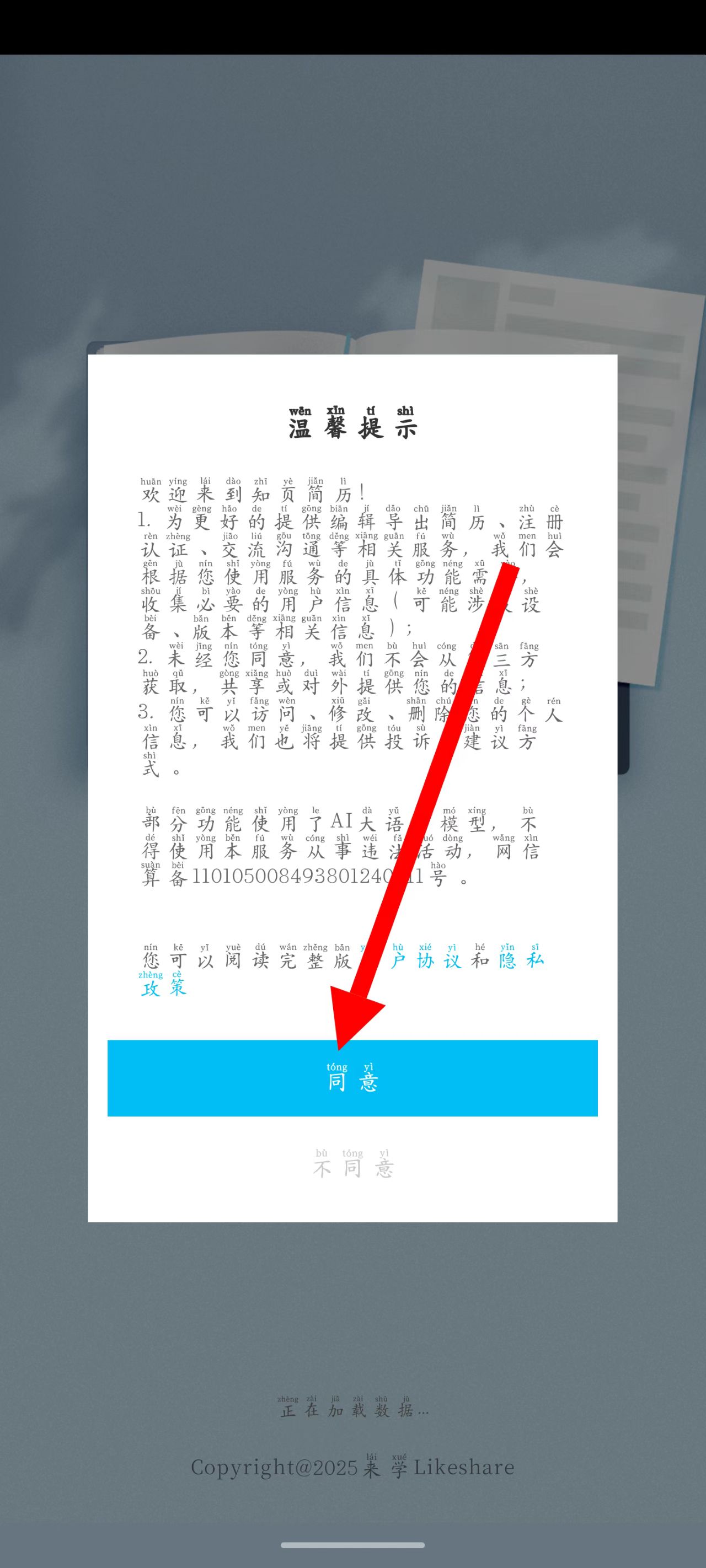 1、打開知頁簡歷APP,在溫馨提示頁面,點(diǎn)擊同意。