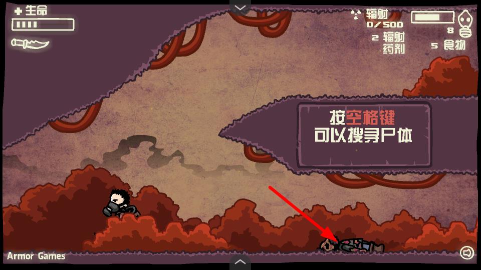2、按空格鍵,可搜尋尸體,獲取相關(guān)資源和道具,補(bǔ)充了生存所需要的物資。