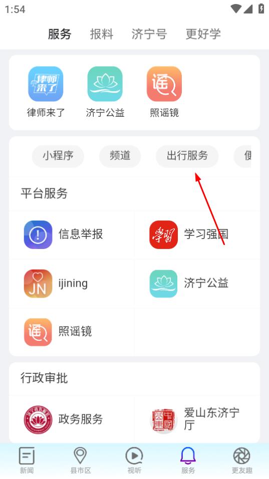 2、在服務頁面,若要查看出行服務,可點擊出行服務。