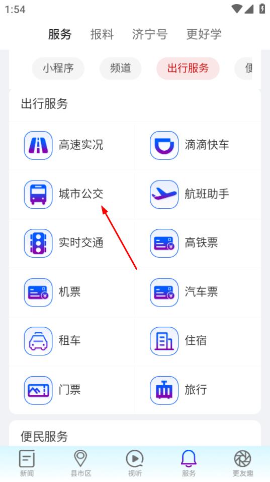 3、進入出行服務頁面后,若想了解城市公交相關信息,可點擊城市公交。