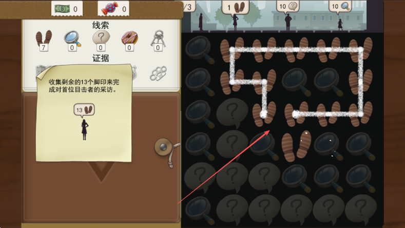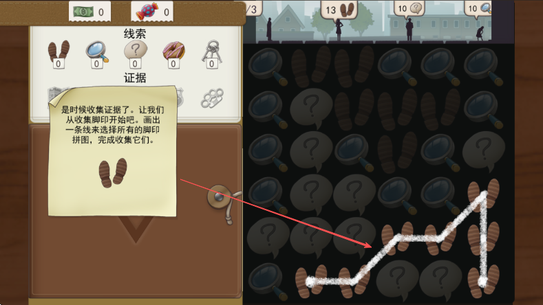 2、進入線索收集環(huán)節(jié),按提示畫出線條選擇所有腳印拼圖來收集腳印線索。