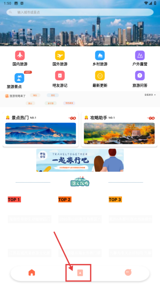 1、打開旅游類應(yīng)用,點(diǎn)擊底部中間的日記圖標(biāo),進(jìn)入日記頁(yè)面。