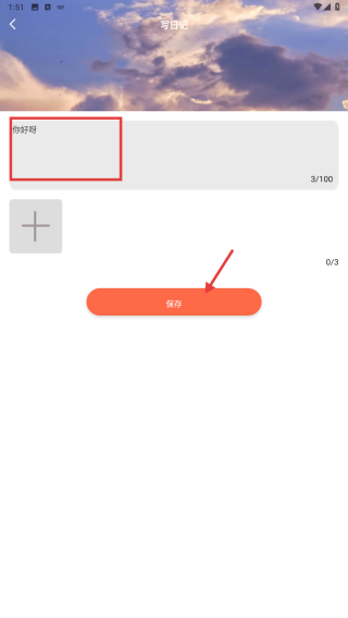 3、在寫日記界面,輸入日記內(nèi)容例如你好呀,點(diǎn)擊保存按鈕。