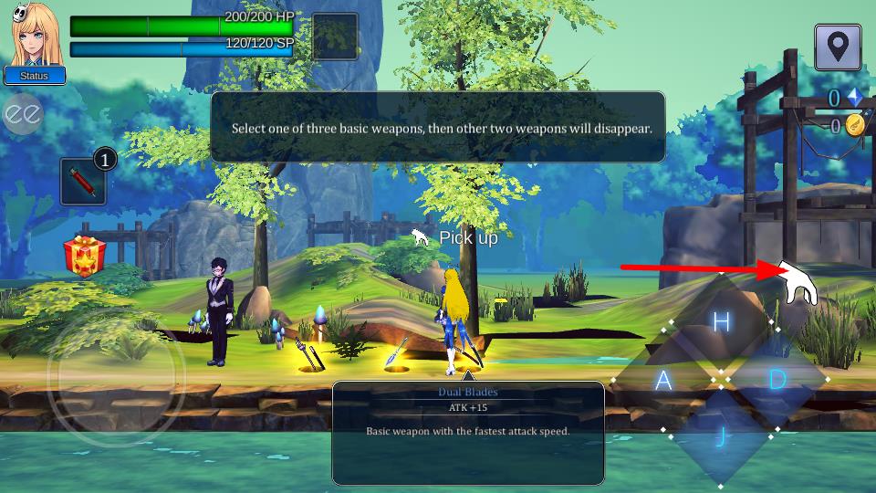 2、按照提示拾取武器,選擇其中一把基礎(chǔ)武器,提升角色攻擊力,其他兩把武器將消失。