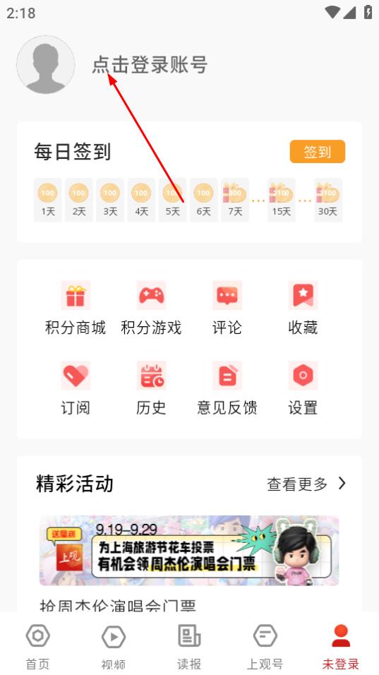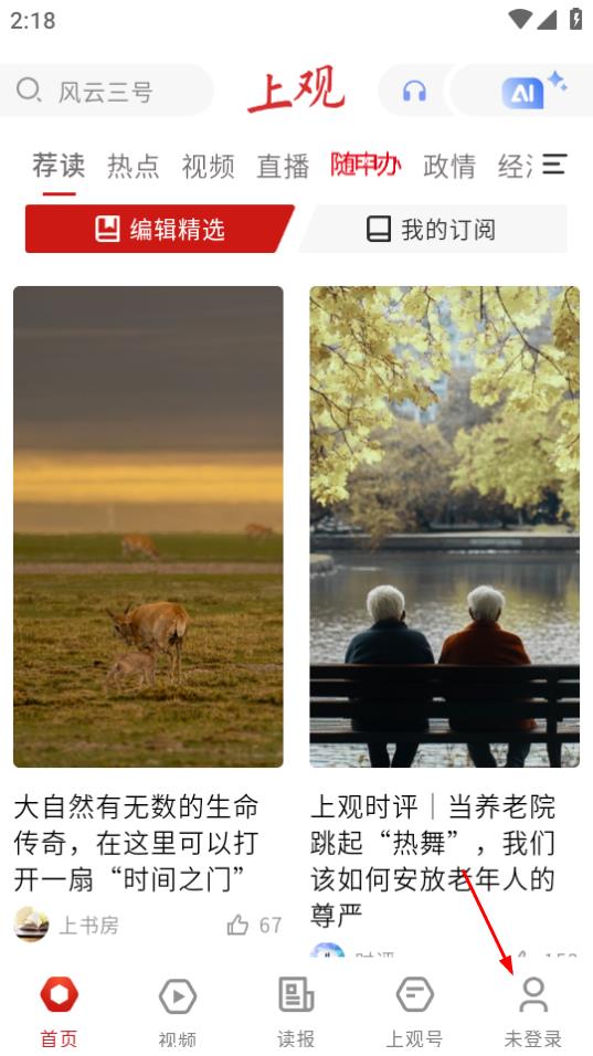 1、進(jìn)入上觀新聞,若要進(jìn)行登錄,可點(diǎn)擊頁(yè)面右下角未登錄。