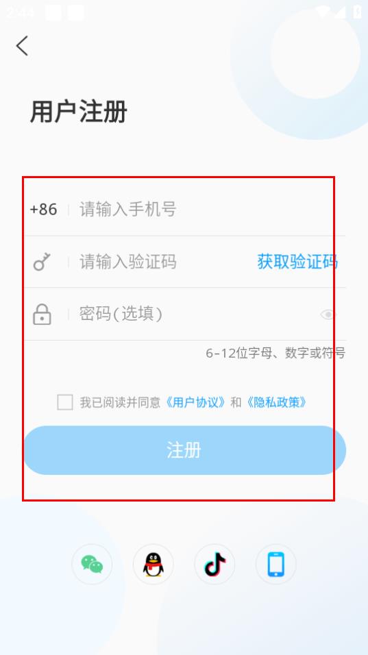 4、在用戶注冊頁面,輸入信息勾選協(xié)議后,點擊注冊按鈕即可。