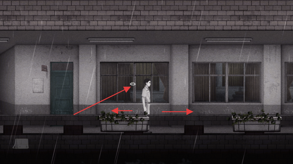 4、來到室外走廊后,控制角色左右移動,同時利用觀察功能留意周圍環(huán)境,尋找新的探索方向。