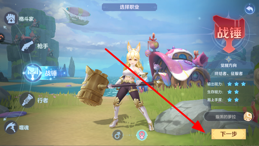 1、進(jìn)入游戲后,在格斗家、槍手、戰(zhàn)錘等職業(yè)中選擇,不同職業(yè)有不同的特點(diǎn)與能力,選好職業(yè),開啟在云上城的冒險(xiǎn)征程。