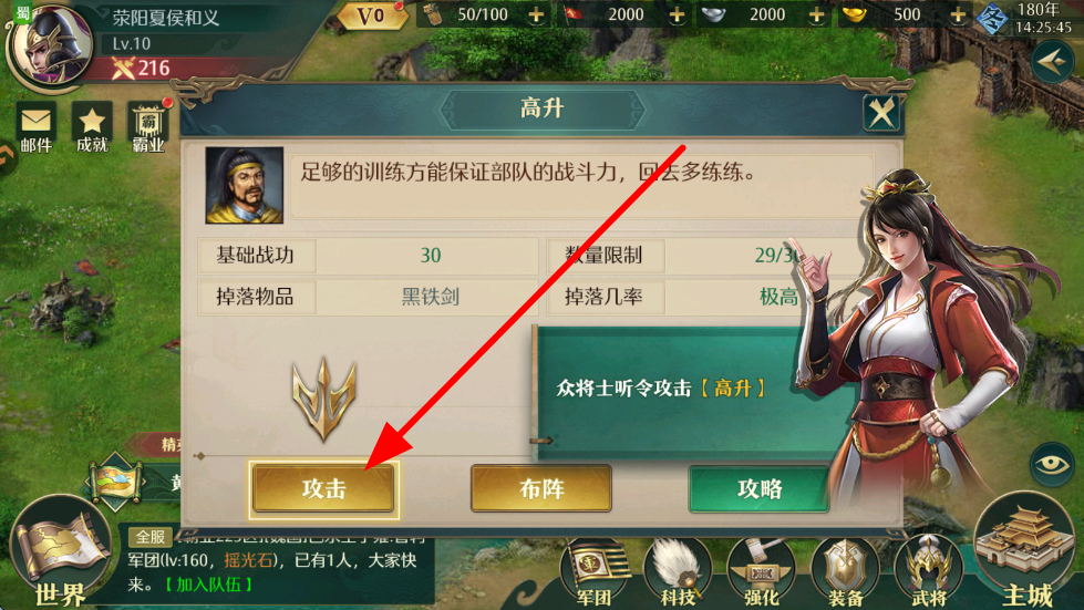2、遇到可攻擊的目標(biāo)時,點擊攻擊按鈕,發(fā)起攻擊指令,讓部隊向目標(biāo)進軍,開啟戰(zhàn)斗,獲取戰(zhàn)功等獎勵,提升實力。