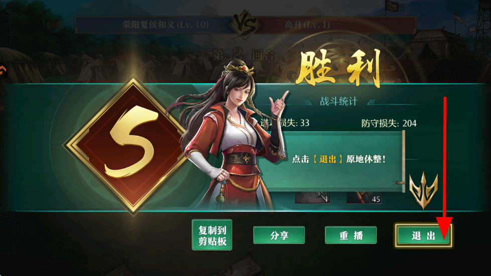 4、戰(zhàn)斗結(jié)束后,會顯示戰(zhàn)斗結(jié)果,若取得勝利,可查看戰(zhàn)斗統(tǒng)計,了解損失等情況,之后點擊退出,結(jié)束此次戰(zhàn)斗。