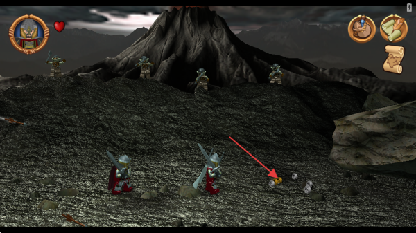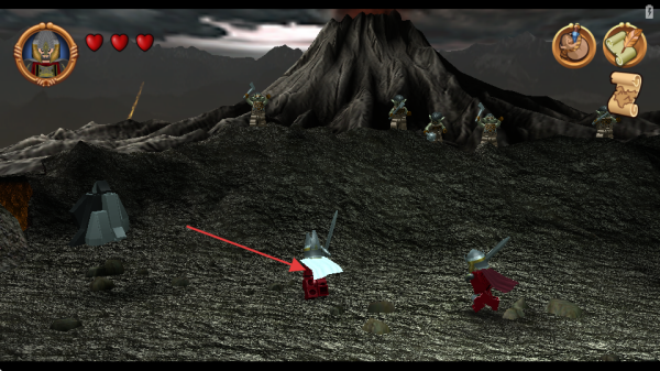 2、控制角色在火山地形移動,注意左上角愛心顯示的血量,警惕遠處敵人,逐步探索場景。