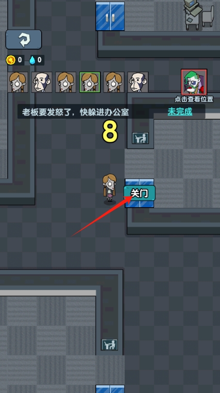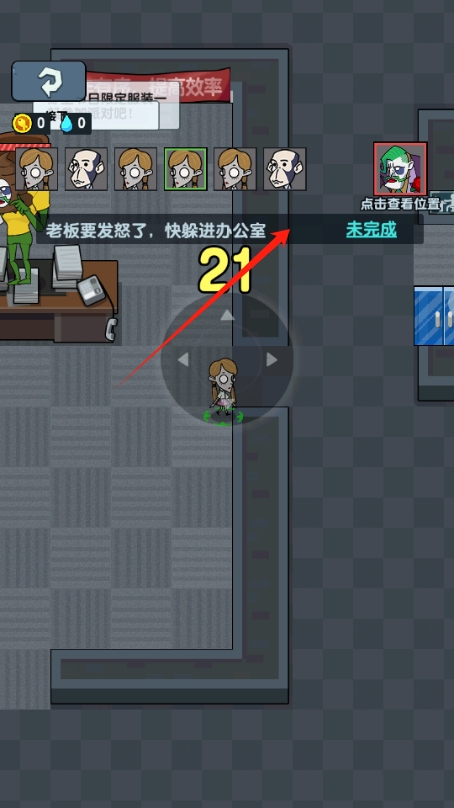 3、查看場景,上方出現(xiàn)老板要發(fā)怒了,快躲進辦公室的任務(wù),規(guī)劃走進辦公室的路線,查看周圍環(huán)境。