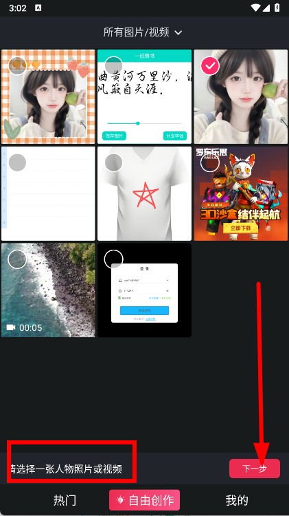 2、在圖片視頻選擇頁面,挑選一張人物照片或視頻,選好后點擊下一步。