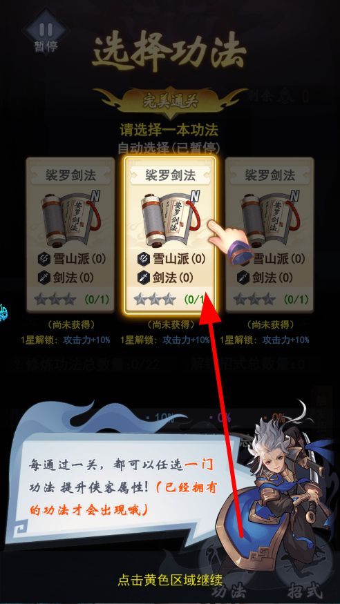 2、每通過一關(guān),會進入功法選擇,從提供的功法中挑選一本,所選功法能提升俠客屬性,助力后續(xù)戰(zhàn)斗,根據(jù)需求合理選擇。