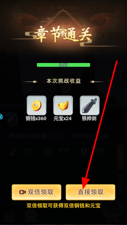 3、章節(jié)通關(guān)后,領(lǐng)取本次挑戰(zhàn)的收益,其中包含銅錢、元寶、武器等獎勵,可選擇直接領(lǐng)取,用于提升角色或裝備等方面。
