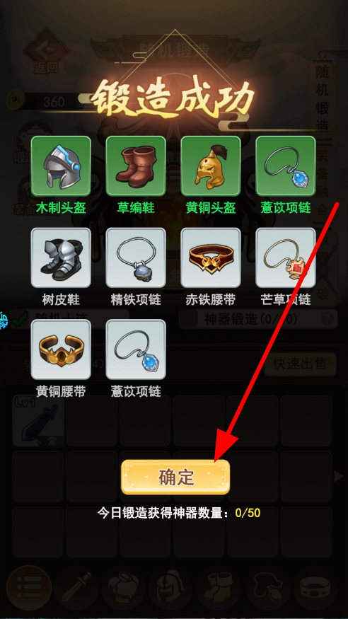 4、進行裝備鍛造,成功鍛造出裝備后,點擊確定,讓角色獲得新裝備,增強角色戰(zhàn)力,在后續(xù)戰(zhàn)斗與闖蕩中更具優(yōu)勢。
