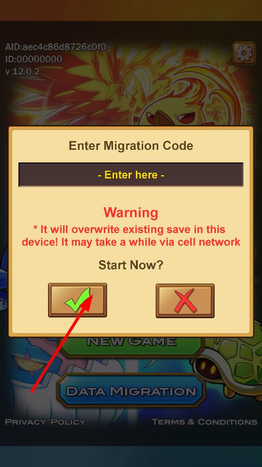 4、點擊對勾的按鍵,數(shù)據(jù)遷移的操作,游戲的數(shù)據(jù)遷移到當前的設備,繼續(xù)之前游戲的進度。