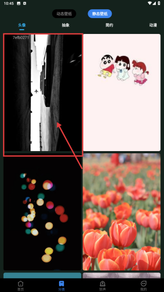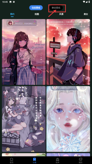 2、在分類頁面,點擊靜態(tài)壁紙分類,瀏覽靜態(tài)壁紙列表。