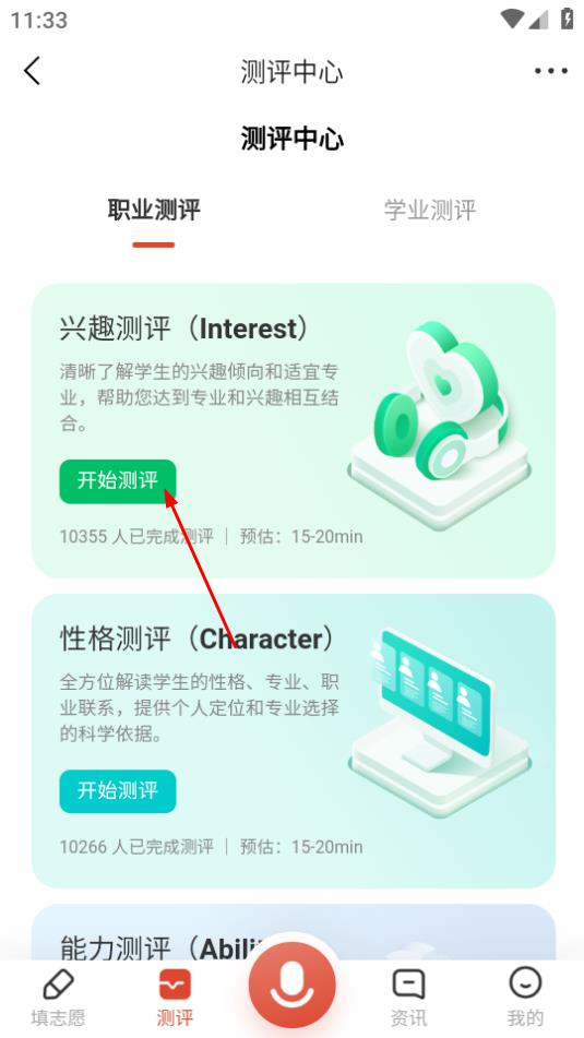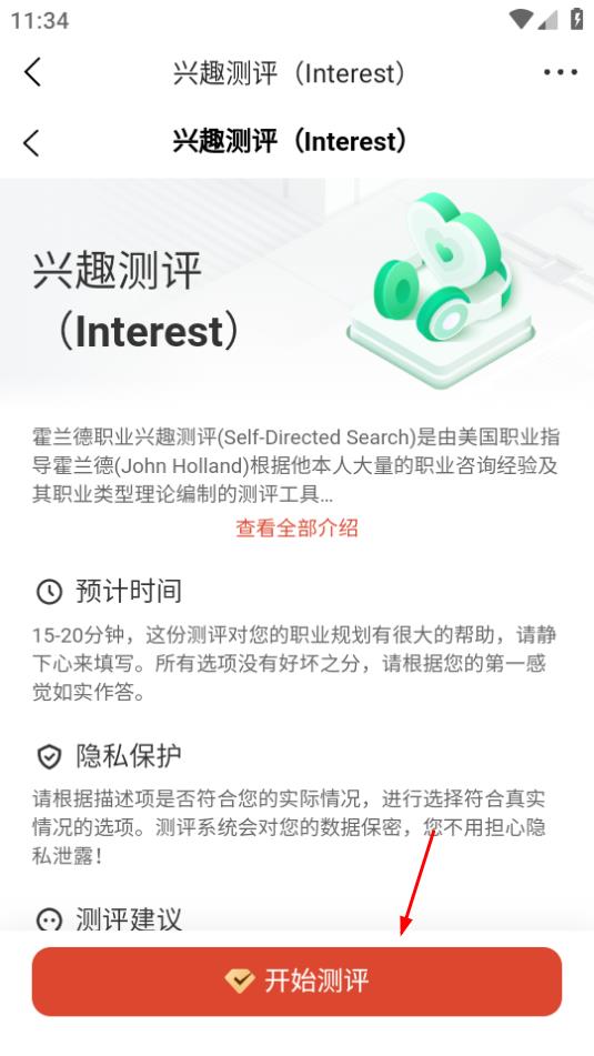 4、在興趣測評頁面,點擊開始測評按鈕,開始興趣測評。