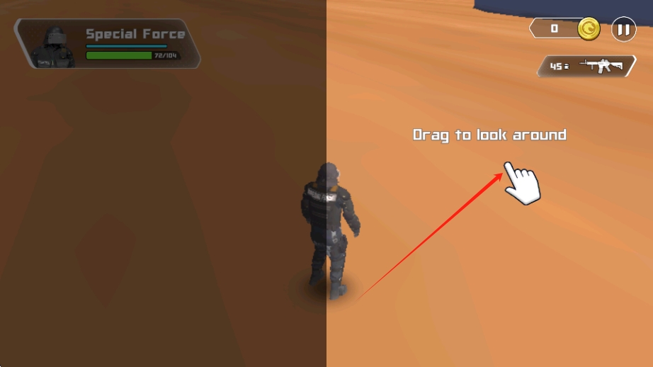 2、通過拖動屏幕可環(huán)顧四周,觀察游戲場景,發(fā)現(xiàn)敵人或關(guān)鍵道具,提升戰(zhàn)場感知能力。