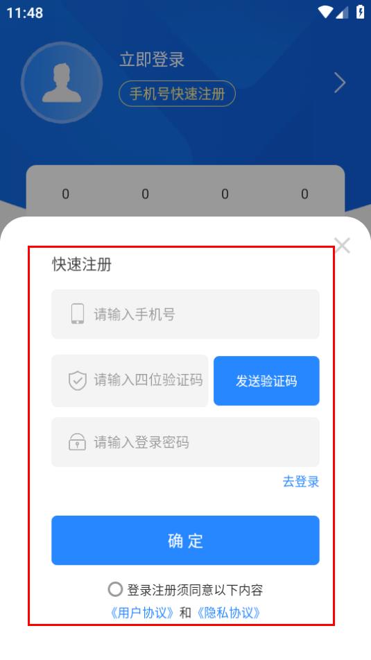 4、在快速注冊界面,輸信息,勾選協(xié)議后點(diǎn)擊確定按鈕,完成注冊。