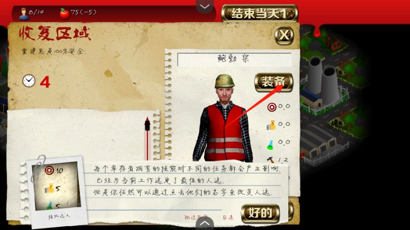 2、點擊裝備按鍵,可給角色配備合適的裝備,提升角色在收復(fù)區(qū)域、執(zhí)行任務(wù)能力。