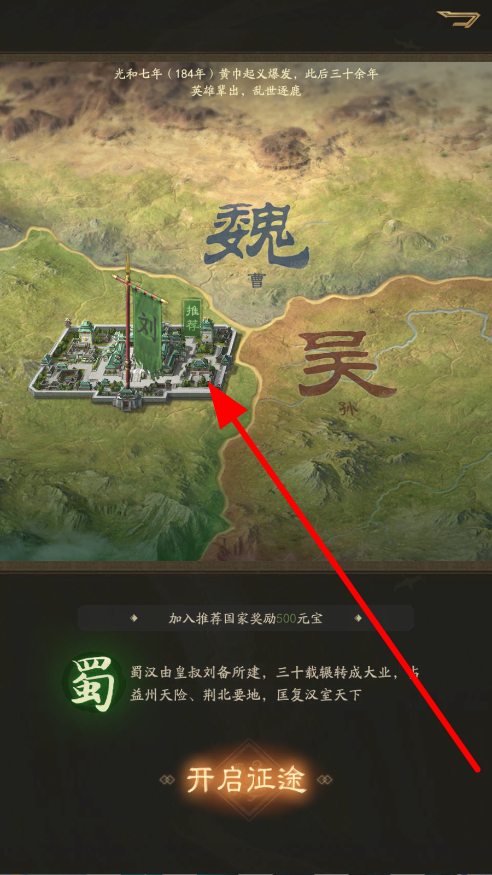 1、新人進(jìn)入游戲,選擇勢(shì)力陣營(yíng),如蜀漢,了解其背景后,點(diǎn)擊開(kāi)啟征途,投身到三國(guó)的紛爭(zhēng)與建設(shè)中。