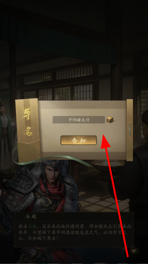 2、玩家會(huì)與馬超等角色交互,在交互中創(chuàng)建需告知尊名,完成這一步驟,能推進(jìn)劇情,開(kāi)啟后續(xù)的冒險(xiǎn)與任務(wù)。