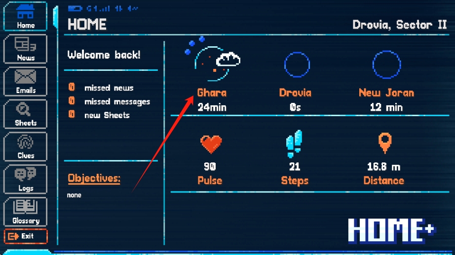 2、關(guān)注界面中箭頭指向的區(qū)域,可了解不同地點的信息,為探索和任務(wù)選擇提供參考。