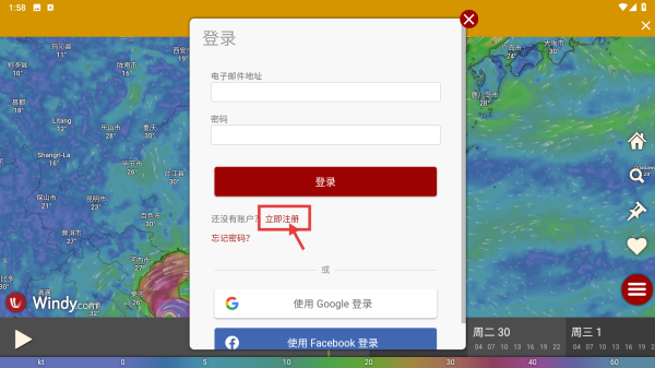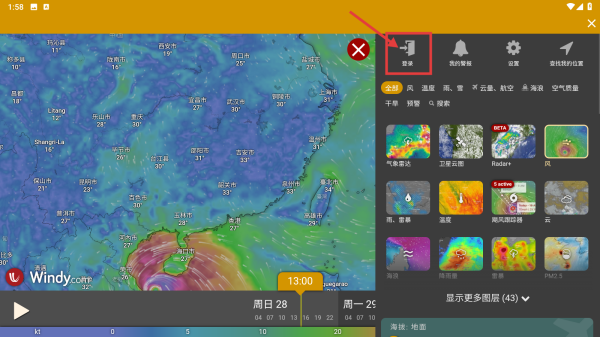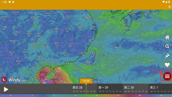 1、打開Windy氣象應用,點擊右側(cè)菜單按鈕,展開功能選項。