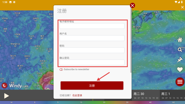 4、在注冊頁面填寫電子郵件地址、用戶名、密碼等信息,點擊注冊按鈕完成賬號注冊。