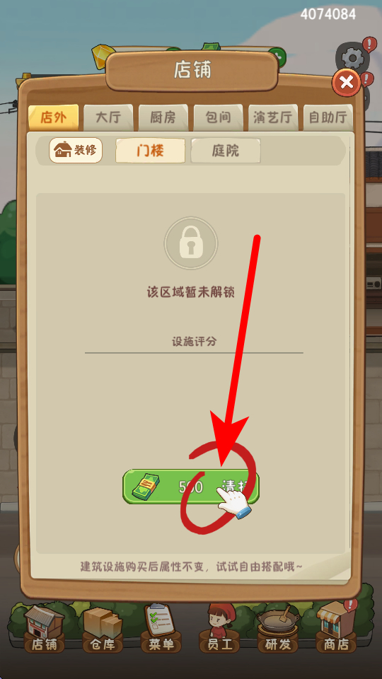 1、進入店鋪界面,在店外區(qū)域找到標有綠色清掃按鈕,點擊可進行對應(yīng)區(qū)域操作。