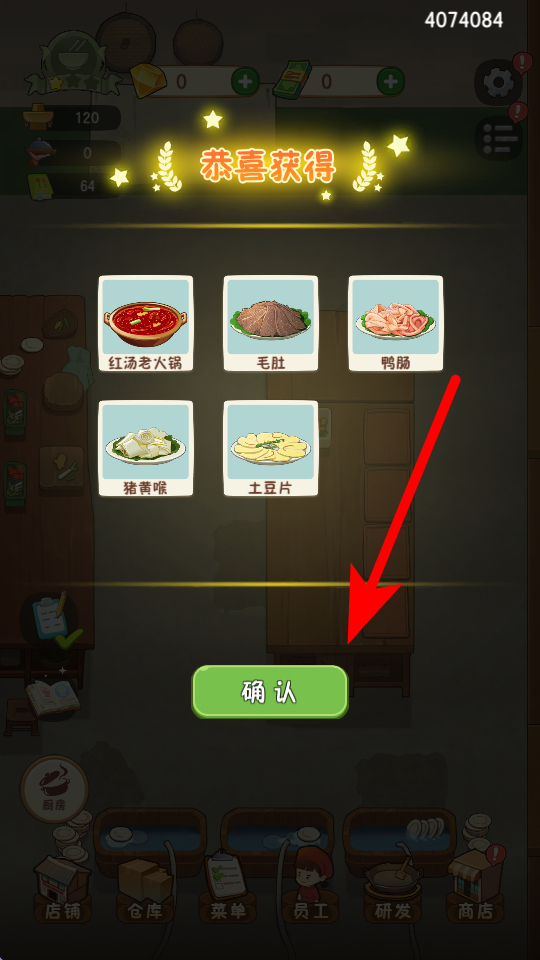 2、獲得新菜品時,界面會顯示恭喜獲得相關(guān)菜品,點擊確認按鈕可結(jié)束該流程。