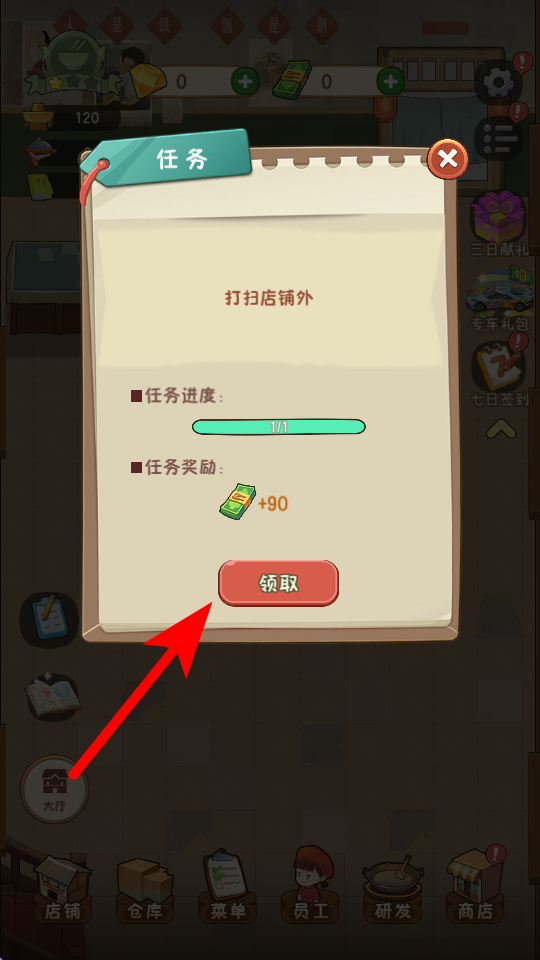 3、完成打掃店鋪外務(wù)后,在任務(wù)界面點擊領(lǐng)取按鈕,能獲得九十的游戲貨幣獎勵。