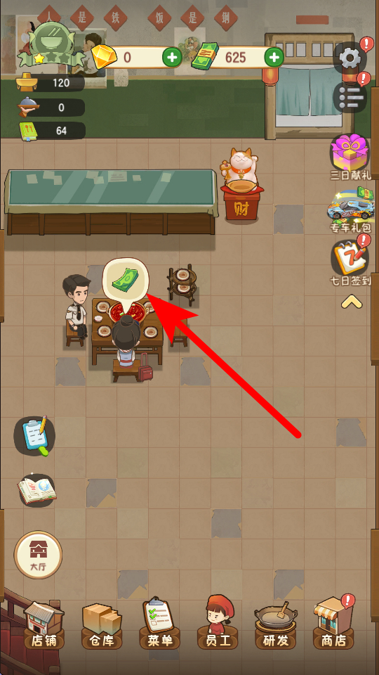 4、在大廳里,顧客用餐結(jié)束后會出現(xiàn)鈔票圖標,點擊該圖標能獲取游戲貨幣。