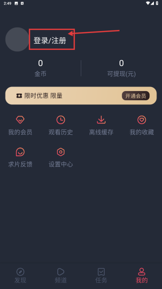 2、在個(gè)人中心頁(yè)面,點(diǎn)擊登錄/注冊(cè)區(qū)域,進(jìn)入賬號(hào)操作界面。